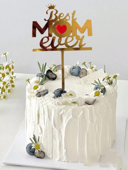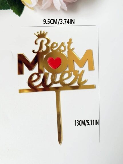 Best mom ever golden acrylic cake topper with red heart Mothers day cake topper