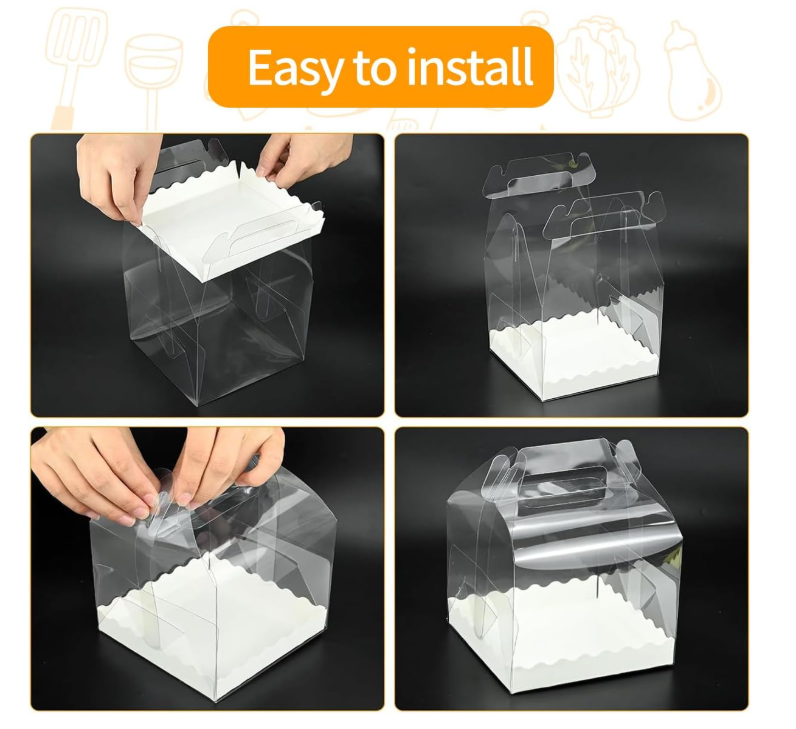 • Transperant Clear Design with Handle :Removing the both side protect films The cake boxes are full clear which can allows clearly show delicious cake or desserts without smashing or dirty cake. Easy take you delicious food any where with handle to More convenient