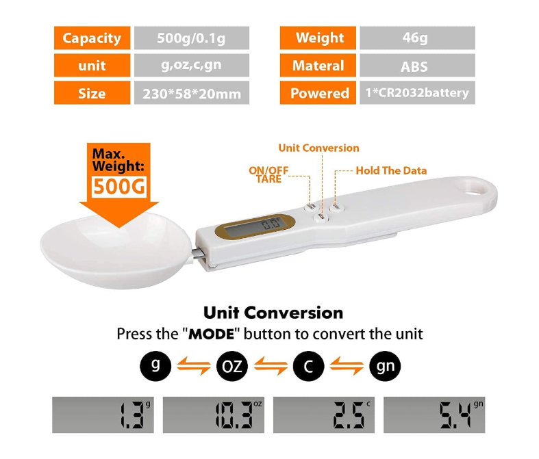 • EASY TO USE: For table-top scales, first you should scoop out the ingredients into a container for measurement, then pour the ingredients from the container into the pot to mix. The spoon digital scale is different from other food scales, only one step, the digital food spoon is load the ingredients and measuring at some time, then put the ingredients directly into the pot and mix, it is more convenient